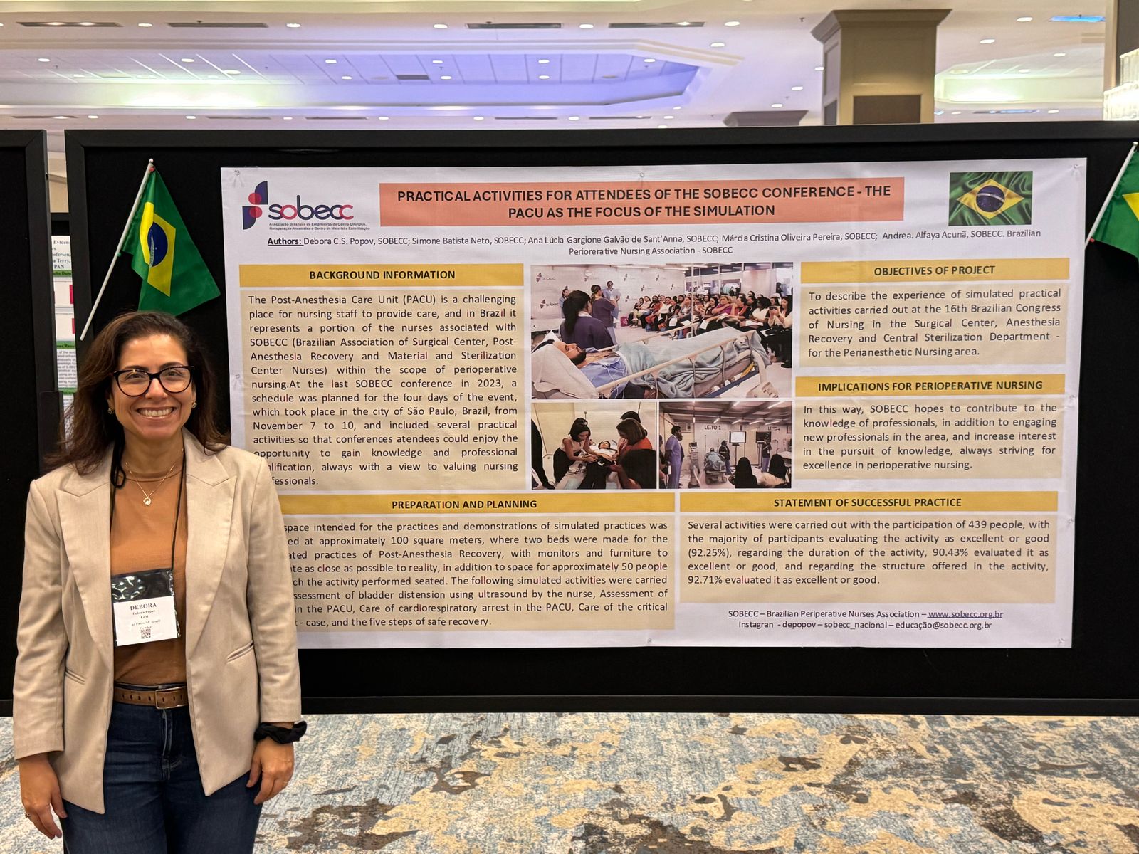 Débora Cristina Popov, Enfermeira e Gestora de Cursos e Treinamentos da SOBECC representou a Associação e novamente, levou e apresentou em plenária um trabalho de Relato de Experiencia com o tema: “Atividades Práticas para participantes do Congresso da SOBECC – A Recuperação Pós-anestésica no foco da simulação”.