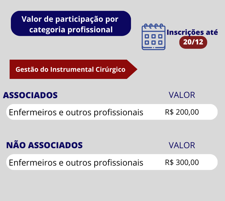 O curso contempla as diversas etapas e diferentes abordagens que o enfermeiro precisa ter no Bloco Operatório e Centro de Material e Esterilização, buscando a excelência da gestão do instrumental cirúrgico. Sabendo que este material é de alto custo e precisa de cuidados e estratégias para a sua eficácia em uso e otimização de processos diversos, desde a fabricação até o uso e manutenção.