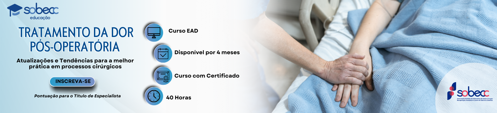 Início do curso: O conteúdo está disponível na plataforma de cursos da SOBECC. O inscrito receberá os dados de acesso em até 72 horas.